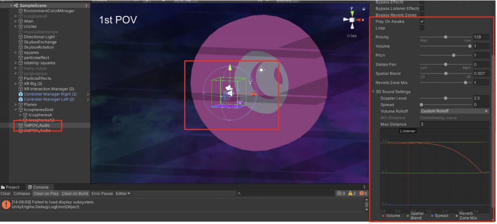 Additionally I changed the settings of the sound in the scene to blend in and not create break in presence. I therefore decided that it is best to create two audio sources and play with them individually. One audio source meant for a player in 1st person POV and the other for a player in 3rd person POV.