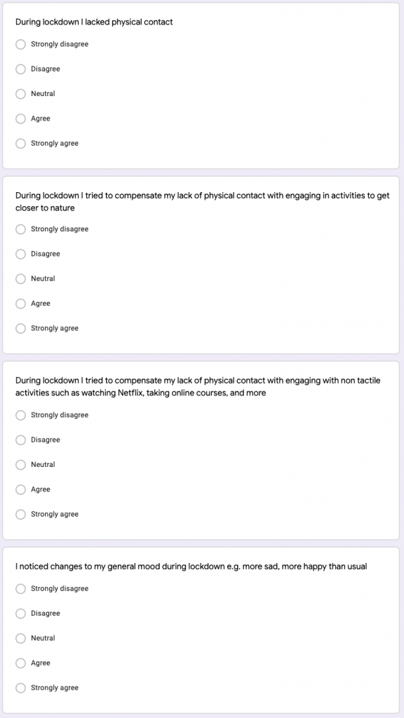 In this questionnaire, I want to test the theory that people went through touch starvation symptoms during lockdown regardless of whether they had some minimal physical contact with some people of their close bubble. I also want to test whether people became more touch averse after the COVID-19 outbreak because the virus is still circulating, even though lockdown is over and vaccinations are in progress. If my theory is correct the more affectionate the participant the more chances they have to have had experienced touch starvation symptoms during lockdown. Additionally, if my second theory is correct, then the questionnaire responses must show an increase of touch aversion level from human to human and from human to objects after the outbreak regardless of how affectionate someone is.