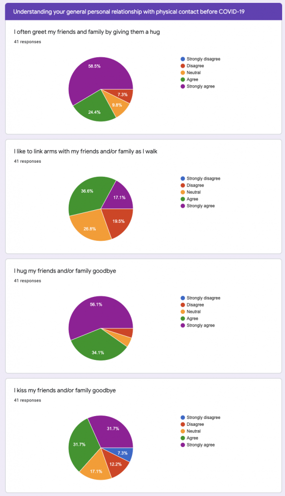 In general, most participants are quite affectionate people based on the second part of the questionnaire. More specifically, approximately 60% of respondents strongly agree and 25% agree on the question of, “I often meet my friends and family by giving them hug”. Most participants agree with the phrase “I like to link arms with my friends and family as I walk”, and most participants hug their friends and family goodbye. More than 90% of the participants hug their friends or family goodbye around 50% of the participants kissed their friends and family goodbye.