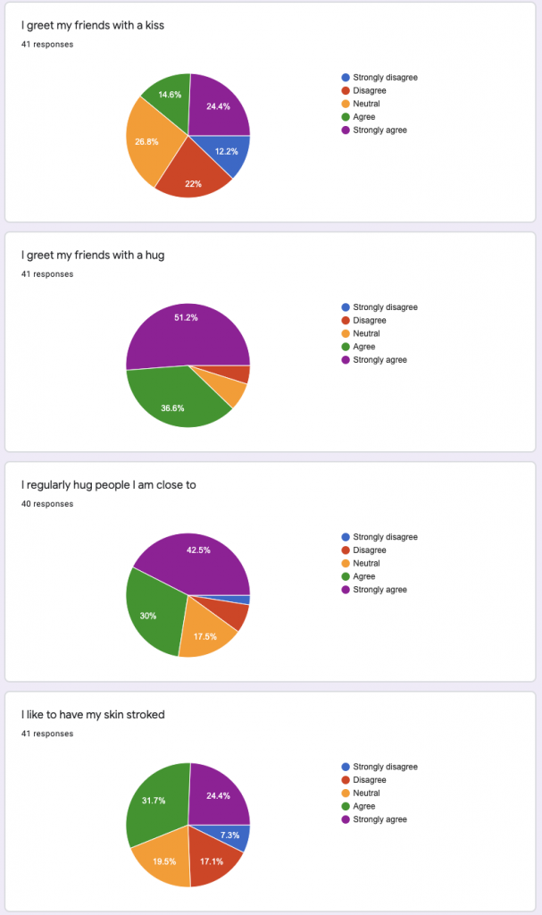 The results of this questionnaire are in line with my two initial theories that lockdown is linked to touch starvation and that the outbreak is linked to a general increase in touch aversion in people. This questionnaire provides reasoning to support my final major project idea of an art experiment through a VR experience that acts as a commentary on the effects of COVID-19 in our society in terms of touch starvation and touch aversion.