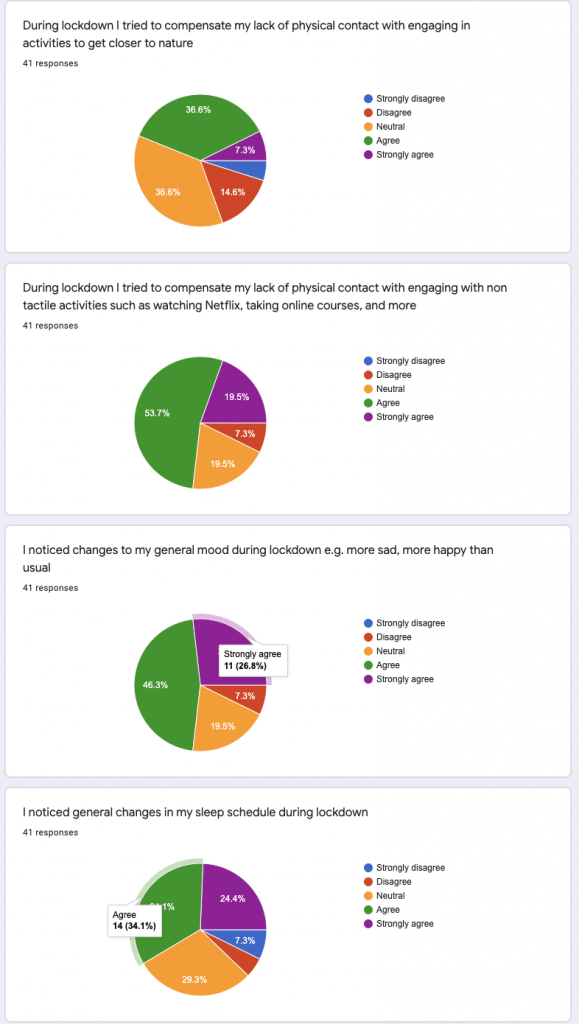 More than 75% of the participants argue they missed having physical contact with their close bubbles and about half of the respondents recognize they lacked physical contact during lockdown. Eighteen respondents tried to compensate their lack of physical contact with engaging in activities that allowed them to have tactile experiences such as exploring nature and thrirty participants engaged in non-tactile activities to supplement their lack of physical contact with their close bubble. 93% of the participants noticed a change in moods during lockdown, 60% had changes in their sleep schedule, 47% had trouble sleeping, 64% noticed an increase in their stress levels, 50% noticed an increase in anxiety, and a 43% recognizes a change in their digestive system. All of the sypmtoms above are symptoms that are prevalent to people who suffer from touch starvation. Of course this is not a medical study and by no means I can make such an assumption about the state of a person, however, I can support the fact that most respondents lacked physical contact.